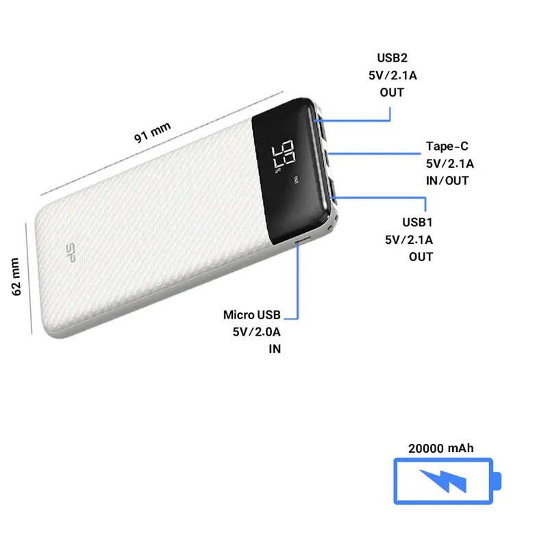 شارژر همراه سیلیکون پاور مدل GS28 ظرفیت 20000 میلی آمپر ساعت، پاوربانکی است که میتوانید بهراحتی و سهولت از آن استفادههای مفیدی داشته باشید. پاوربانک را میتوان بهعنوان باتری یدک برای دستگاههای دیجیتالی بهخصوص موبایل، تبلت و اکسسوریها دانست. شارژر همراه سیلیکونپاور مدل GS28 ظرفیت 20000 میلی آمپر ساعت محصولی از برند سیلیکونپاور است که در ابعاد کوچک و جمعوجور طراحی و تولید شده است. اولین و مهمترین مشخصه برای انتخاب پاوربانک ظرفیت آن است. این مدل ظرفیت 20000 میلیآمپرساعت دارد. وزن این مدل 412 گرم و در دسته شارژر همراههای معمولی قرار میگیرد. این مدل 2 ورودی برای شارژ پاوربانک در اختیارتان قرار میدهد. دو کانکتور microUSB و USB-C برای شارژ شدن و دو نوع Type-A که میتواند دو دستگاه را به طور همزمان شارژ کنند. با شدتجریان ورودی 2.0 آمپری، میتوان پاوربانک را با سرعت بیشتری شارژ کرد. از این پاوربانک میتوانید برای شارژ کردن تبلت خود هم استفاده کنید.
