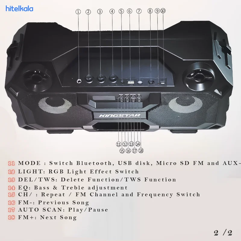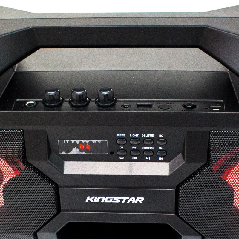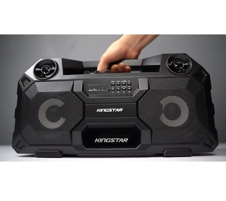 اسپیکر KBS330 کینگ استار بوم باکسی دیگر از سری اسپیکرهای تولید شده توسط کمپانی « کینگ استار» (kingstar) است که در بازار جهانی و همینطور ایران عرضه گشته است. این اسپیکر حرفه ای مانند یک کیف اسپورت ورزشی طراحی شده است، حتی با نگاه کردن به آن به شما حس قدرت را منتقل می کند. این اسپیکر دارای صفحه نمایش LED نیز هست و به شما در پیدا کردن ترک مورد نظر خود و یا فرکانس رادیویی کمک خواهد کرد. بله درست متوجه شدید، این محصول از رادیو FM نیز پشتیبانی میکند. صفحه کلیدی که در کنار این صفحه LED مشاهده میکنید به شما امکاناتی چون تنظیم رقص نور جستجوی کانال تغییر مود و … را می دهد. در قسمت بالایی آن کلید های چرخشی کم و زیاد کردن صدا و صدای میکروفون قرار دارد. همچنین دارای سوکت میکروفون و AUX نیز می باشد. بوم باکس بلوتوثی کینگ استار مدل KBS330 از فلش مموری و کارت میکرو و AUX نیز پشتیبانی میکند. شما علاوه بر اتصال از طریق بلوتوث می توانید با یک کابل AUX و یا فلش مموری و حتی کارت میکرو لیست آهنگ های مورد علاقه خود را با این اسپیکر پخش کنید. این محصول با ابعاد 46x17.3x24.3 سانتی متری اش دارای دو بلندگوی 12 واتی با سایز 4 اینچ است. فرکانس پاسخ گویی آن 70 تا 20 هزار هرتز می باشد. این محصول قطعا صدایی شفاف و بسیار با کیفیت را ارائه می دهد و نیاز شما را به یک اسپیکر در خانه، مهمانی و حتی سفر بر طرف خواهد کرد. در طراحی این محصول به مدرن بودن محصول توجه شده است. اگر باشگاه کوچکی دارید این اسپیکر نیاز شما را برطرف خواهد کرد. در صورتی که می خواهید از این اسپیکر در جشن های خود استفاده کنید، می توانید آن را با اسپیکر همنام دیگر سینک کنید و با آهنگ خود شعاع بیشتری را پوشش دهید. این اسپیکر همچنین دارای ورودی میکروفون نیز هست و با یک میکروفون می توانید در خانه و یا در جمع دوستان آواز بخوانید و سخنرانی کنید.