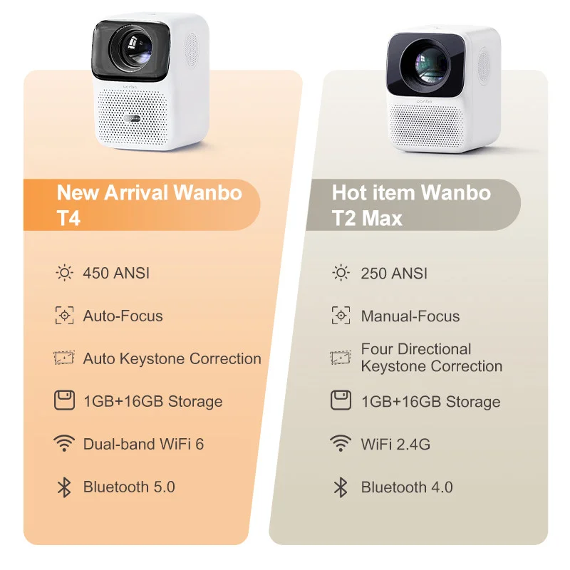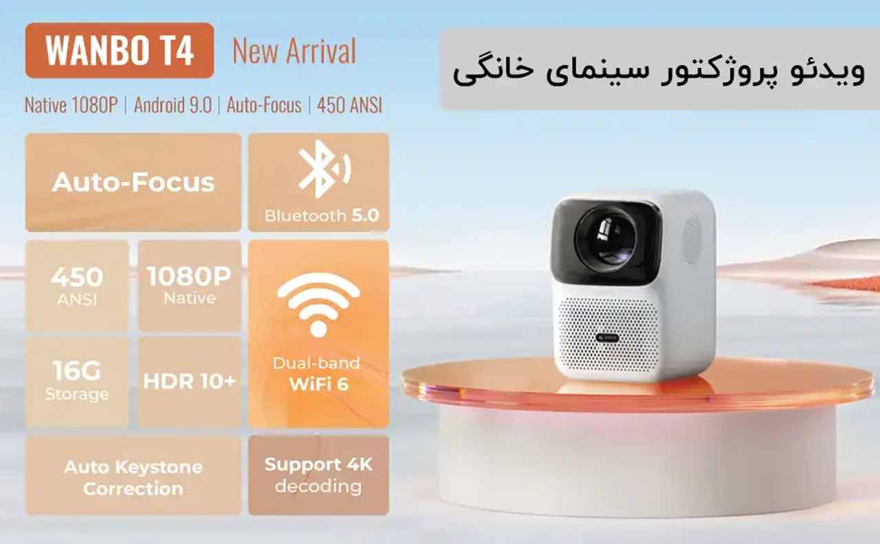 برند Wanbo یکی از نامهای محبوب در میان تولیدکنندگان ویدیوپروژکتور محسوب میشود. این شرکت مدل جدیدی به نام Wanbo T4 ارائه کرده است و از نظر زیبایی بسیار چشم نواز است. همچنین در سطح عملکردی گامهای رو به جلوی قابل توجهی در مقایسه با مدلهای پیشین خود دارد که این شرکت موفق به برداشتن آنها شده است(نظیر فوکوس خودکار). Wanbo T4 با شکل و شمایل رایج که معمولا پروژکتورهای سنتی ما را به آن عادت دادهاند، متفاوت است. ابعاد این ویدیوپروژکتور x 15 x 18.5 12.7 سانتی متر بوده و وزن آن تنها 1.2 کیلوگرم است. طراحی Wanbo T4 به گونهایست که کاملاً راحت در دست قرار میگیرد. جنس این ویدیوپروژکتور سفیدرنگ از نوع پلی کربنات طراحی شده است و در قسمت جلویی یک اپتیک مهم از شیشه ساخته شده، در حالی که در پایینتر یک قسمت کاملاً سوراخ وجود دارد که به لطف سیستم خنککننده کارآمد با هیتسینکهای مسی ساخته شده از پروژکتور اجازه میدهد هوا را سریع پخش کند. علاوه بر این، بخش مرکزی ویدیوپروژکتور که مستطیل گرد کوچکی را در خود جای داده که در آن جا لنزی تعبیه شده و به لطف هوش مصنوعی به پروژکتور اجازه میدهد تا در کمتر از 3 الی 4 ثانیه به طور خودکار فوکوس کند. در Wanbo T4 دو بلندگو(هر کدام 3 وات) وجود دارند که تجربه صوتی را نسبت به مدلهای پیشین بهبود میبخشد، اگرچه از نظر فنی با سختافزار تقریباً یکسانی روبرو هستید. با این حال، در قسمت بالایی، حلقه فوکوس ناپدید میشود و تنها یک دکمه روشن و خاموش ظاهر میشود، زیرا برای بقیه عملکردها یک کنترل از راه دور جمع و جور و مناسب در اختیار شما قرار دارد. در پشت Wanbo T4 ورودیهای مختلف برای منبع تغذیه، یک پورت USB برای پخش محتوا از منابع خارجی، یک ورودی HDMI برای اتصال کامپیوتر، کنسول یا موارد دیگر و یک جک 3.5 میلیمتری در صورت تمایل به اتصال وجود دارد. البته باید گفت که Wanbo T4 از بلوتوث نیز پشتیبانی میکند، بنابراین در صورت تمایل میتوانید بدون استفاده از کابلهای مزاحم دستگاههای صوتی خارجی خود را متصل کنید. در حالی که در مدل پیشین این ویدیو پروژکتور از شدت نور 200 آنسی لومن فراتر نمیرفت، در این مدل Wanbo T4 موفق به ارائه 450 انسی لومن میشود که برای پروژکتوری در این محدوده قیمت قطعا بالاتر از میانگین بازار است.