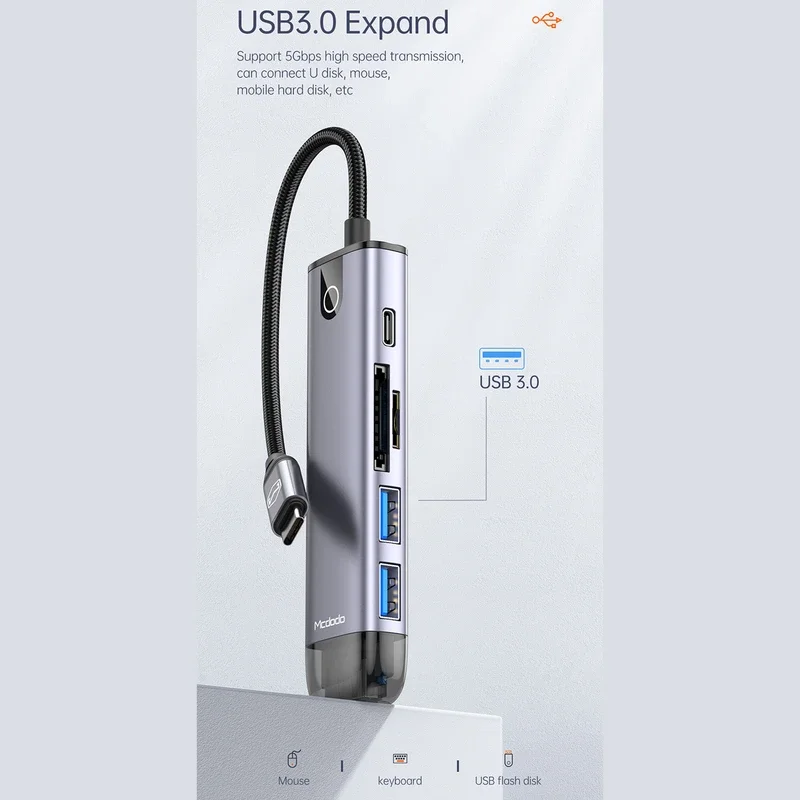شرکت Mcdodo از تولید کننده های خوشنام لوازم جانبی با کیفیت می باشد. هاب آداپتور تایپ سی چند کاره مک دودو mcdodo 6 in 1 usb-c hub HU-774 یکی از کاربردی ترین تولیدات این شرکت است تا کاربران بتوانند به کمک یک پورت ورودی تایپ سی دستگاه خود را به یک پورت تایپ سی، سه پورت ورودی USB و یک پورت HDMI تبدیل می کند.