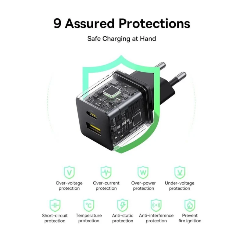 شارژر دیواری 30 وات بیسوس مدل Palm Fast Charger 30W به همراه کابل تبدیل تایپ سی : طراحی جمع و جور و ارگونومیک : یکی از جنبه های کلیدی هر شارژر ابعاد آن است. شارژر سریع Palm Baseus با اندازه جمع و جور و مینیاتوری خود جلب توجه می کند: 31 در 31 در 54 میلی متر. به دلیل اندازه آن، واحد شارژ به راحتی در یک جیب یا کیف قرار می گیرد و آن را به یک همراه ایده آل برای سفر تبدیل می کند. وزن این شارژر تنها 53 گرم است. سبک وزن و قابل حمل، Baseus Palm برای کاربران فعالی که نیاز به شارژ دستگاه های خود در حال حرکت دارند، ایده آل است. شارژ دو پورت : یکی دیگر از مزایای شارژر سریع Palm Baseus قابلیت شارژ همزمان دو دستگاه است. این به ویژه در شرایطی که نیاز به شارژ سریع چندین دستگاه دارید، راحت است. به عنوان مثال، می توانید تلفن هوشمند و هدفون خود را به طور همزمان شارژ کنید، که برای استفاده فعال از تلفن خود با دستگاه های بی سیم عالی است. پشتیبانی از شارژ سریع : شارژر سریع Palm Baseus از چندین پروتکل شارژ سریع محبوب مانند PD3.0 و QC3.0 پشتیبانی می کند. این قابلیت به شما امکان می دهد زمان شارژ دستگاه های خود را به میزان قابل توجهی کاهش دهید، که به ویژه در زمان تمام شدن زمان بسیار مهم است. توانایی شارژر این شارژر برای شارژ آیفون 15 از 0 تا 54 درصد تنها در 30 دقیقه، نمونه درخشانی از فناوری و کارایی بالای آن است. این آن را به گزینه ای ایده آل برای کاربرانی تبدیل می کند که نیاز به شارژ سریع گوشی خود در سفر یا پس از استفاده طولانی دارند. فناوری BCT برای محافظت در برابر گرمای بیش از حد امنیت دستگاه های شما باید همیشه اولویت اصلی شما باشد. شارژر سریع Palm Baseus مجهز به BCT (فناوری خنک کننده Baseus) است که از گرمای بیش از حد محافظت می کند. این ویژگی به طور خودکار دما را در طول فرآیند شارژ تنظیم می کند و اطمینان می دهد که دستگاه های شما حتی زمانی که شارژر به شدت مورد استفاده قرار می گیرد ایمن باقی می مانند. بلوک شارژ با 9 مدار حفاظتی داخلی مانند حفاظت از اتصال کوتاه، ولتاژ و دمای بیش از حد، شارژ مطمئن و ایمن دستگاه های شما را تضمین می کند. هنگام استفاده از شارژر می توانید مطمئن باشید که دستگاه شما آسیب نمی بیند.