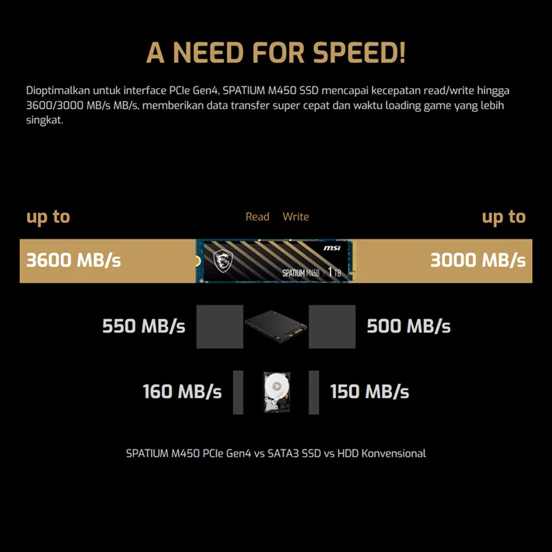 هاردها به دلیل آن که برای ذخیرهسازی اطلاعات از قسمتهای الکترومکانیکی استفاده میکنند در برابر ضربات، شوکها و لرزشها بسیار حساس هستند و احتمال آسیبدیدگی آنها و از دست رفتن اطلاعات وجود دارد اما حافظههای SSD برخلاف هارددیسکها برای انجام پردازشهای مربوط به ذخیرهسازی اطلاعات از هیچ قسمت حرکتی استفاده نمیکنند و این موضوع باعث مقاومت آنها دربرابر شوک میشود. هارد ام اس آی SPATIUM M450 PCIe 4.0 NVMe M.2 دارای ظرفیتی 500 گیگابایتی است. این هارد ابعادی برابر 80x22x2.15 میلیمتری دارد. این هارد 9700 گرم وزن دارد. این هارد قابلیت بهینه سازی عملکرد (TRIM) دارد. همچنین دارای فناوری خود نظارت، تجزیه و تحلیل و گزارش (SMART) بوده و دارای رمزگذاری و امنیت داده ها (Pyrite) است. میانگین عمر این هارد 1500000 ساعت خواهد بود.