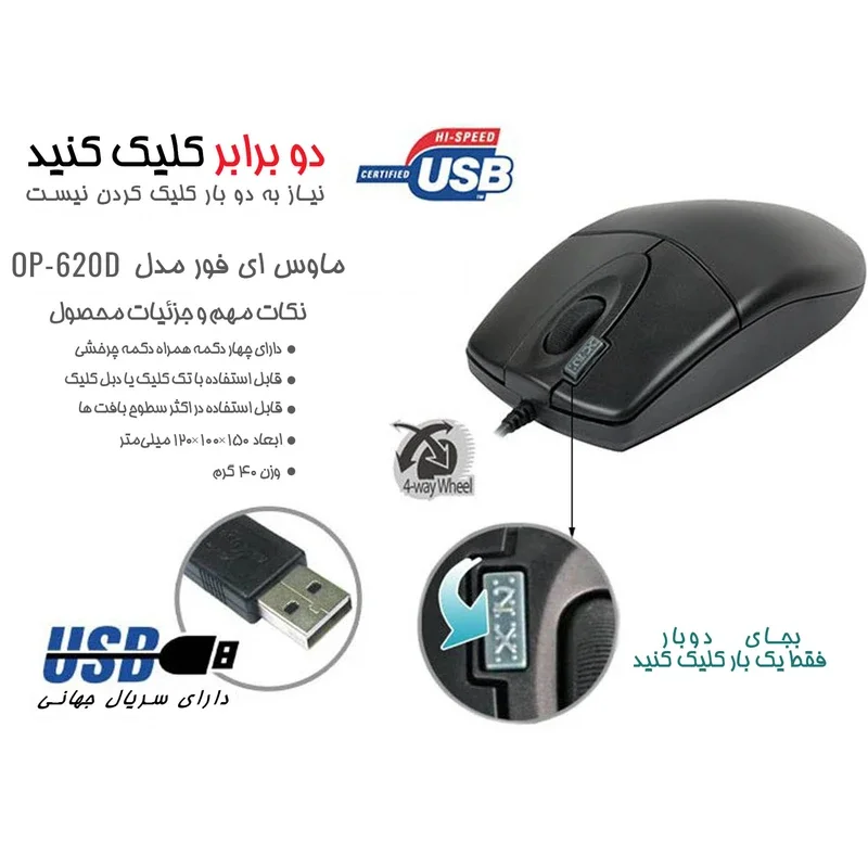 کمپانی ایفورتک در سال 1987 میلادی در تایوان تاسیس گردید. عمده فعالیت این برند مرتبط با لوازم جانبی کامپیوتر اعم از ماوس، کیبورد، هدفون، وبکم و.. می باشد. از برند ای فورتک می توان بعنوان یک برند بسیار با کیفیت در تولید لوازم جانبی کامپیوتر در کنار قیمت منصفانه یاد برد. امروز می خواهیم یکی از محصولات پر فروش این شرکت یعنی ماوس OP-620 معرفی و ویژگی های این محصول بپردازیم. - ماوس OP-620 یکی از محصولات باکیفیت این کمپانی بوده که مناسب برای کار های روزمره می باشد، این ماوس در دو مدل OP-620D و OP-620DS به بازار عرضه شده که در اینجا ما به معرفی جدیدترین مدل این محصول یعنی OP-620DS می پردازیم. x مدل OP-620DS دارای ابعاد 119x63x36 میلی متر با وزن 91 گرم بوده که بسیار ارگونومیک و مناسب دست می باشد. در هنگام کار با آن حس خوبی به کاربر منتقل خواهد کرد. طول کابل این ماوس تقریبا 150 سانتی متر می باشد و دقت ماوس 1000DPI بوده، عمده تفاوت این مدل یعنی OP-620DS با مدل OP-620D در سایلنت بودن یا همان بی صدا بودن دکمه ها می باشد که باعث حذف صداهای اضافه و نرم و روان بودن دکمه می شود. و همچنین با دارا بودن دکمه دابل کلیک، کار کردن با آسان خواهد بود. نکته مهم: متاسفانه از این برند اجناس فیک و غیر اصل زیاد در بازار ایران دیده می شود لطفا هنگام تهیه محصول حتما از اصالت کالا مطمئن شوید. این محصولات توسط شرکت نوترنیک که نماینده و گارانتی کننده اصلی برند ای فورتک در بازار ایران می باشد. تهیه نمایید در صورت بروز مشکل بتوانید از خدمات پس از فروش این شرکت استفاده نمایید.
