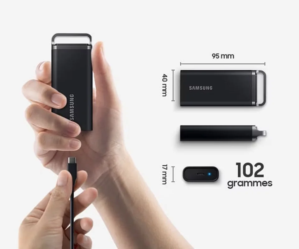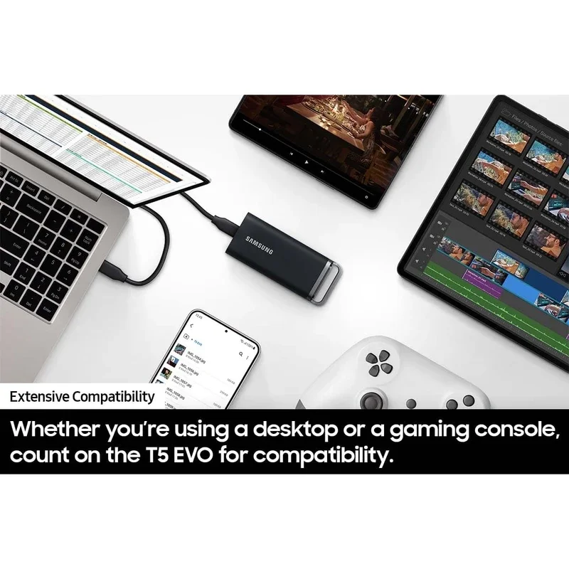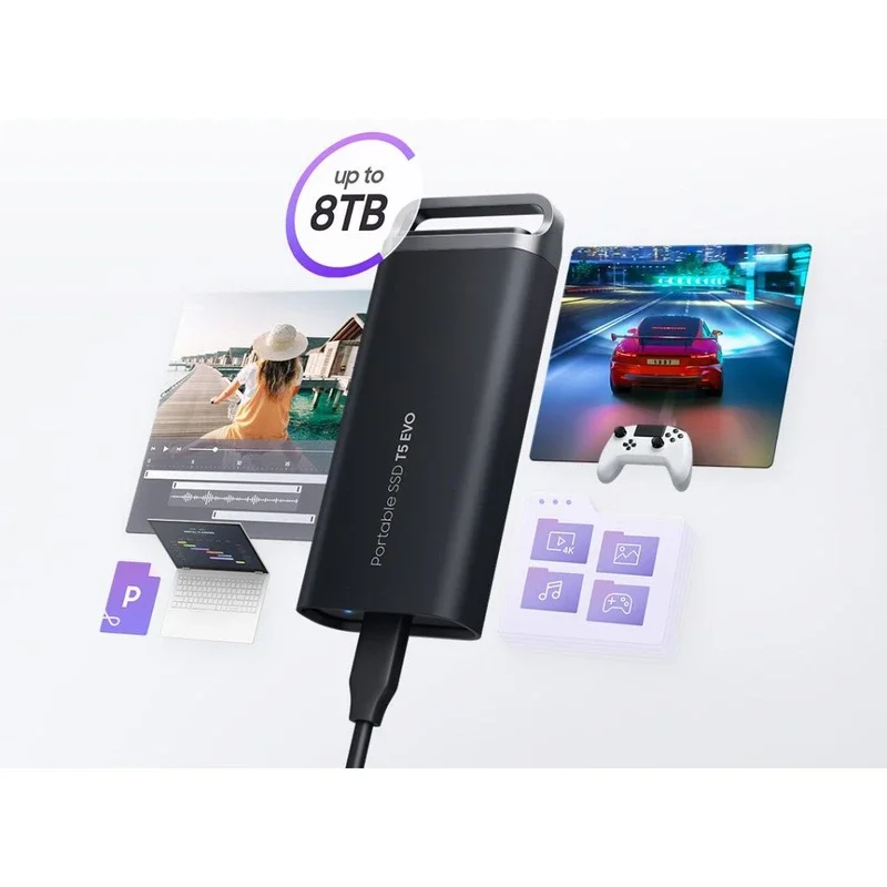• با T5 EVO کوچک اما قدرتمند که با ظرفیت ذخیره سازی 4 ترابایت در دسترس است، هر جا که پروژه شما را می برد، صرفه جویی زیادی داشته باشید. • T5 EVO برای انتقال فایل های بزرگ با TurboWrite هوشمند و سرعت بهبود یافته بهینه شده است. • این یار قوی و مستحکم با مقاومت در برابر ضربه و محافظت در برابر سقوط تا ارتفاع 6 فوت به شما کمک میکند تا آن را کامل ببینید.¹ • چه از دسکتاپ یا یک کنسول بازی استفاده کنید،² برای سازگاری روی SSD قابل حمل T5 EVO حساب کنید. ما بزرگ شدیم و آن را قابل حمل ساختیم. این T5 EVO است – یک انتخاب ایدهآل برای گیمرها و تولیدکنندگان محتوا. این SSD به گونهای طراحی شده است که انتقال فایلهای بزرگ را در حالی که کوچک است انجام میدهد با T5 EVO کوچک اما قدرتمند، هر جا که پروژههایتان شما را میبرد، یک پسانداز بزرگ انجام دهید. به اندازهای سبک است که میتوان آن را به همه جا برد و با ظرفیتهای 2 تا 8 ترابایتی عرضه میشود، که آن را به راهی آسان برای ذخیرهسازی بیشتر در حین حرکت تبدیل میکند. هاردهای اکسترنال را فراموش کنید. T5 EVO برای انتقال فایل های بزرگ با TurboWrite هوشمند بهبود یافته بهینه شده است و سرعتی که هارد دیسک شما به آن حسادت می کند. برای عملکرد عالی توسط USB 3.2 Gen 1 پشتیبانی می شود. خواه از دسکتاپ، دوربین یا کنسول بازی استفاده میکنید،² برای سازگاری گسترده، روی SSD قابل حمل T5 EVO حساب کنید. وقتی صحبت از استفاده سنگین از برنامه یا ذخیره فایل می شود، یک بازیکن واقعی تیم است کارهایت را انجام بده با خیال راحت آن را ذخیره کنید. کار شما با سطوح امنیتی قابل اعتماد از طریق رمزگذاری سخت افزار 256 بیتی AES محافظت می شود.