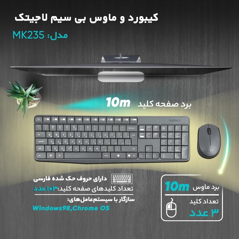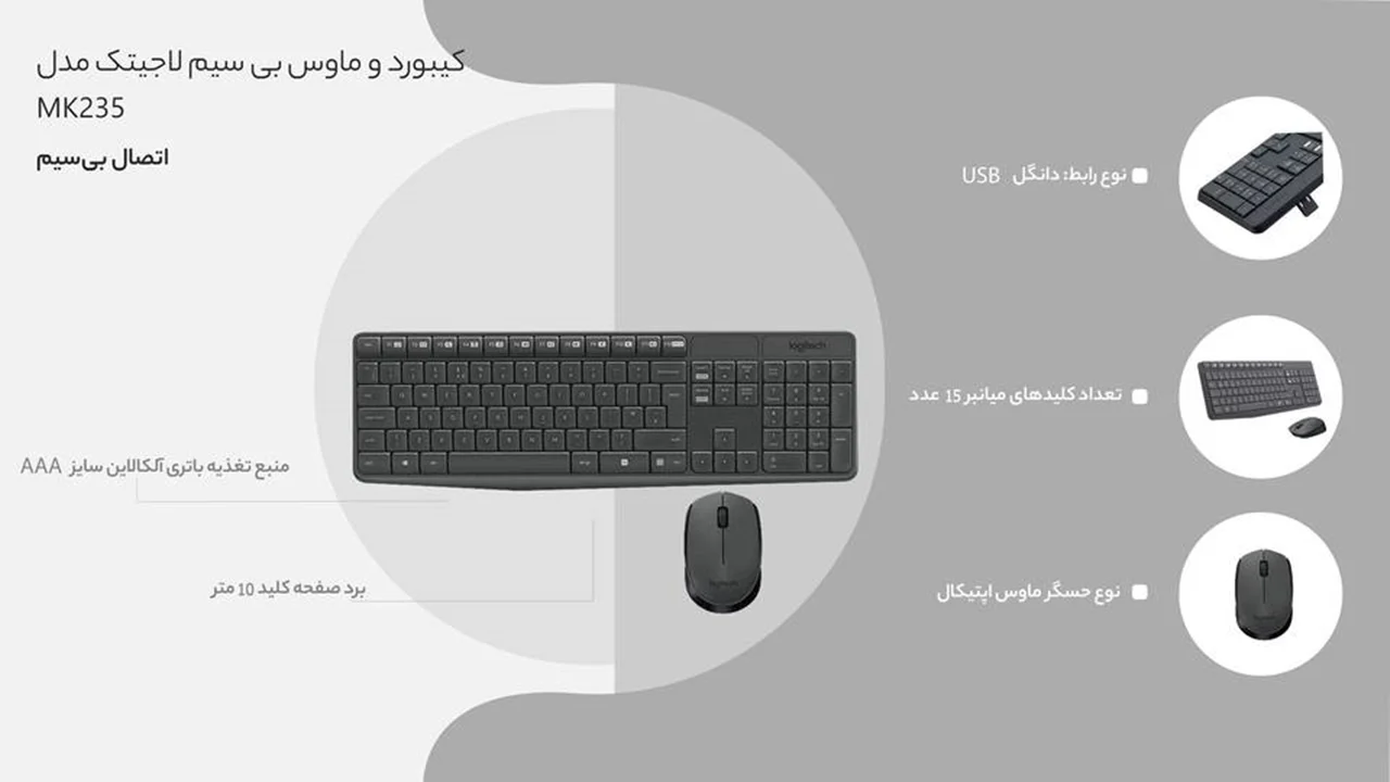 کیبورد « MK235» از طریق دانگل USB به رایانه شما متصل میشود و شما را در انجام فعالیتهای رایانهای همراهی میکند. فرکانس کیبورد MK235 برابر با 2.4 گیگاهرتز است که به کمک آن میتوان تا فاصله 10 متری از رایانه خود با این کیبورد کار کنید. این محصول شرکت لاجیتک دارای قسمت کلیدهای عددی است که برای کاربرانیکه با نرمافزارهای مالی سر و کار داردند، گزینه مناسبی خواهد بود. کلیدهای این کیبورد از میزان حساسیت بالایی بهره میبرند که با کمترین میزان فشار وارد کردن به کلیدها میتوان از آنها استفاده کرد. کیبورد MK235 دارای 15 کلید اصلی برای انجام فعالیتهای اصلی کامپیوتر است. علاوهبر کلیدهای اصلی چند کلید میانبر مالتیمدیا برای انجام سریعتر فعالیتهای پرکاربرد رایانه به چشم میخورد. شرکت لاجیتک به همراه این محصول یک ماوس ساده بیسیم ارایه کرده است که توسط همان دانگل مربوط به کیبورد به رایانه متصل میشود و نیازی به اشغال درگاههای دیگر در رایانه نیست. این ماوس دارای سه کلید برای انجام فعالیتهای غیرحرفهای و روزمره است. کیبورد لاجیتک مدل MK235 انرژی خود را از دو باتری لیتیومی تامین میکند که به دلیل مصرف انرژی بسیار کمی که دارد، تا مدتها بدون نیاز به تعویض باتریها از آن استفاده کرد.