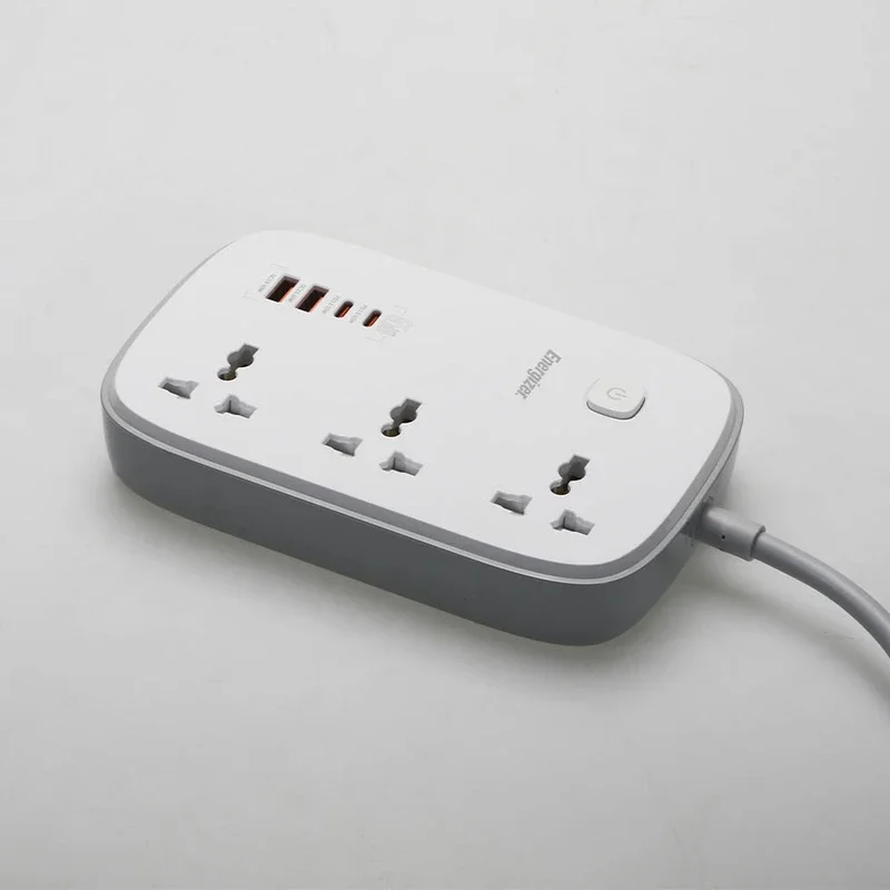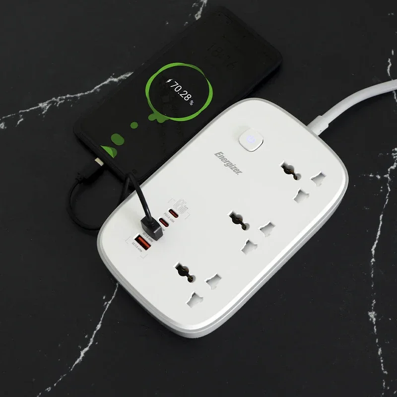 برند انرجایزر (Energizer) پس از تولید موفق کالاهای الکترونیک و ورود بازار ایران، به تولید لوازم جانبی از جمله سه راهی برق روی آورد و محصولات باکیفیت و قیمت مناسبی را روانهی بازار کرد. این چند راهی برق در ابعاد 178*112*33.2 میلیمتر و وزن 601 گرم قادر است خروجی یک پریز برق شهری را به 3 پریز یونیورسال (سه شاخه)، 2 پورت USB و 2 پورت تایپ سی (Type-C) تبدیل کند و با انواع دوشاخه یا سهشاخههای بکار رفته در نقاط مختلف جغرافیایی سازگار است. همانطور که اشاره شد چند راهی برق انرجایزر مدل EPB3250W00EU به پورتهای USB و تایپ سی مجهز شده است که به کمک آنها میتوان با اتصال انواع سیم شارژ یا شارژر، دستگاههای دیجیتال و موبایل را به سادگی شارژ کرد. این پورتها که از فناوریهای QC3.0 پشتیبانی میکنند، دارای نرخ جریان و ولتاژ زیر هستند: USB-A (QC output): 4.5V/5A , 5V/4.5A , 5V/9V/12V/20V=3A (60W Max) USB-C: 5V/3A , 9V/3A – 12V/3A – 15V/3A – 20V/3.25A (65W Max – PD) همچنین سه پریز یونیورسال (سه شاخه) نیز دارای شدت جریان خروجی 13 آمپر و حداکثر توان خروجی 3250 وات خواهد بود. این محصول با طراحی سفید رنگ و با یک سیم به طول 2 متر ارائه شده است و با بدنهی کوچک و جمعوجور خود، جای چندانی را اشغال نمیکند. با این چندراهی برق انرجایزر میتوانید از شر تبدیلهای سهشاخه به دوشاخه خلاص شده و به دهکدهی جهانی وارد شوید. از دیگر نکات مهم این محصول جنس بدنه آن است که از پلاستیک با کیفیت و مقاوم ABS ساخته شده و ضد اشتعال است.