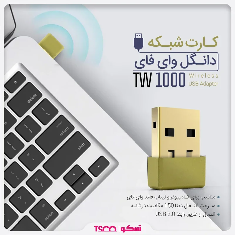 با فراگیر شدن تکنولوژی WIFI و وجود مودمهای بیسیم در اکثر خانهها و ادارات و محل کارها، نیاز به دریافتکنندهی این امواج بیش از پیش احساس میشود. تعداد بسیار زیادی از پیسیهای قدیمی و یا حتی جدید فاقد گیرندهی داخلی WIFI هستند و برای همین باید یا با کابل به اینترنت وصل شوند یا به گیرنده مجهز شوند. دانگلهای WIFI این مشکل را برطرف کردهاند. با وصل کردن دانگل WIFI به پورت USB دستگاه، کامپیوتر شما به راحتی به اینترنت وصل میشود و دیگر نیازی به باز کردن کیس کامپیوتر و قرار دادن قطعهی گیرندهی WIFI داخل دستگاه نخواهد بود. کارت شبکهی TW1000 محصولی از برند تسکو است که از طریق USB به رایانه متصل میشود. ابعاد این کارت شبکه مانند یک فلشمموری بند انگشتی است که به راحتی میتوان را به رایانه متصل کرد و از وجود شبکهی بیسیم لذت برد. از ویژگیهای بسیار خوب این محصول میتوان به پشتیبانی آن از سیستم عاملهای رایج و به خصوص نسخههای مختلف سیستم عامل ویندوز اشاره کرد. این کارت شبکه از استاندارد IEEE 802.11 b g n پشتیبانی میکند و برای بالابردن امنیت شبکه از تنظیمات امنیتی WEP WPA/WPA2 بهره میبرد.