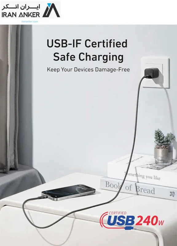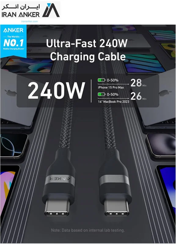 کابل فوق سریع ۲۴۰ واتی: این کابل ۲۴۰ واتی دارای گواهی USB-IF می تواند مک بوک پرو ۱۶ اینچی (۲۰۲۳) شما را تنها در ۲۸ دقیقه تا ۵۰ درصد یا آیفون ۱۵ پرو را تا ۵۰ درصد در ۲۶ دقیقه شارژ کند.