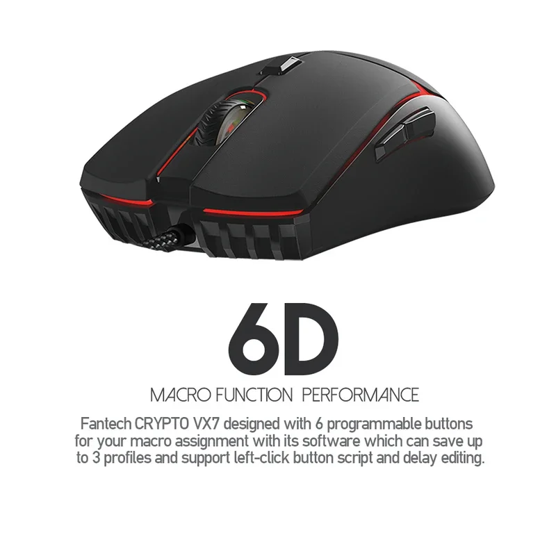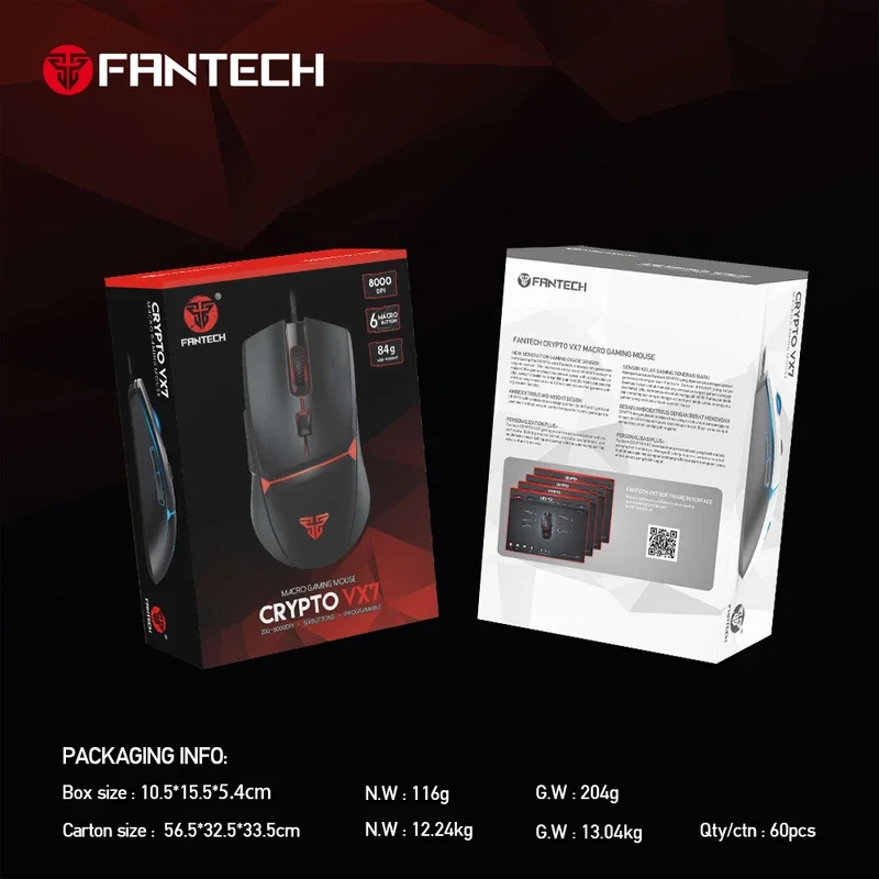 ماوس فنتک مدل VX7 CRYPTO از تولیدات دسته ی ماوس های مخصوص بازی شرکت فنتک می باشد.ویژگی اصلی این مدل طراحی و پاسخ دهی خوب آن است که به لطف یک سنسور اپتیکال مجهز به سوئیچ تغییر میزان DPI می باشد. محدوده حساسیت ماوس به حدود 8000 DPI می رسد. ضربه پذیری دکمه های ماوس VX7 فنتک در حدود 10 میلیون کلیک می باشد که برای ماندگاری بیشتر حتی در شرایط بسیار شدید ساخته شده و در عین حال سرعت پاسخگویی بسیار سریعی دارد. نوع اتصال ماوس گیمینگ فنتک VX7 از طریق کابل از جنس نایلون بافته شده به طول 1.8 متر می باشد. ماوس VX7 دارای 6 کلید با قابلیت برنامه ریزی می باشد. همچنین دارای نورپردازی با 4 رنگ متفاوت نیز می باشد که جلوه بصری زیبایی به این ماوس بخشیده است.