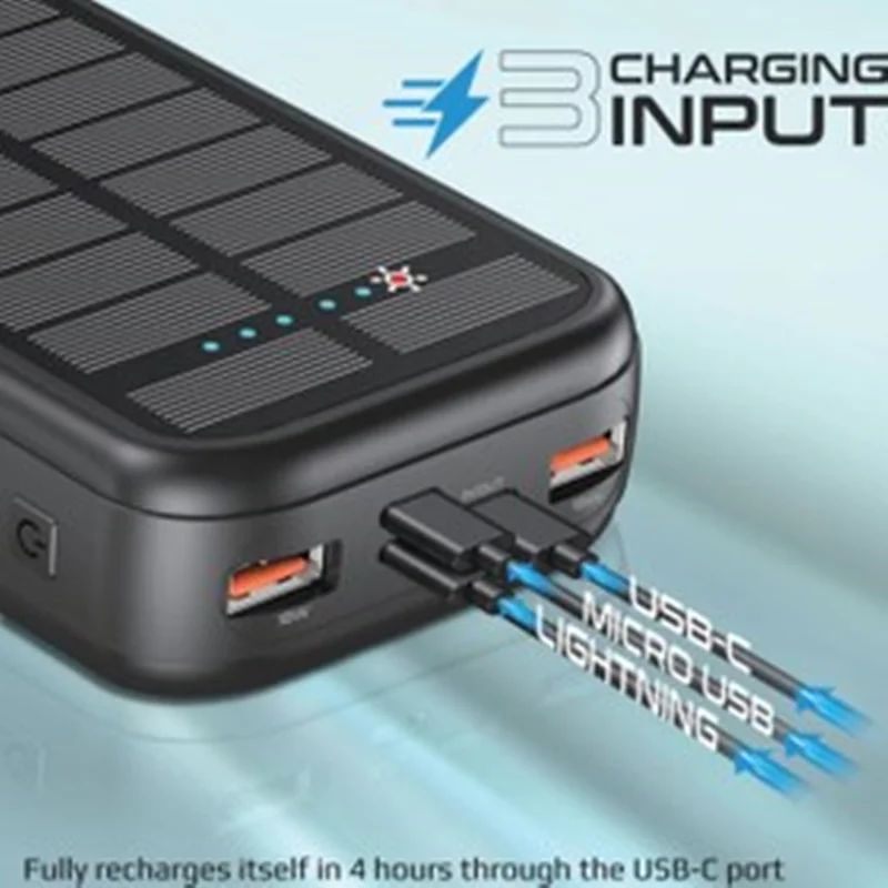 پاوربانک خورشیدی 20000 گرین مدل GNPDSOLPB20، دارای یک پنل خورشیدی با توان ورودی 0.8 وات و نشانگر دیجیتالی برای نمایش شارژ باقی مانده که روی بدنه پاوربانک قرار دارد. ظرفیت کلی پاوربانک 20000 است و شما می توانید 5 گوشی را همزمان شارژ کنید. دو کابل تایپ c و لایتنینگ دارد برای مواردی که شارژر را فراموش کرده اید می توانید از این دو کابل متصل به پاوربانک استفاده کنید. علاوه بر این دو کابل 5 پورت خروجی و ورودی برای شارژ کردن گوشی دارد که شامل 1 پورت تایپ c و 1 پورت USB خروجی است. پورت های ورودی برای شارژ پاوربانک شامل پورت تایپ c، لایتنینگ و پورت Micro USB می شود. سبک و قابل حمل است، به راحتی می توانید هر جایی آن را با خود ببرید و نگران بدون شارژ ماندن گوشی نباشید.