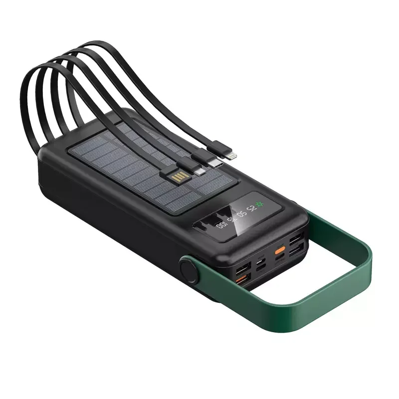 پاوربانک 30000 خورشیدی گرین مدل Solar max یک پاوربانک همه چیز تمام با پنل شارژ خورشیدی میباشد که بدون نیاز به دسترسی به برق شهری ، تنها با قرار گرفتن در معرض نور خورشید ، باتری آن شارژ میشود . این پاوربانک برای کسانی که دائما در حال سفر ، گشت و گذار ، طبیعت گردی ، کمپینگ و … هستند بسیار مناسب است .اولین ویژگی که نظر هر کاربری را جلب میکند ، بی نیازی به حمل کابلهای اضافه میباشد ، زیرا این پاوربانک دارای 4 کابل کوتاه USB-A ، Type-C ، Micro و Lightning است که متصل به پاوربانک میباشد و هر نوع موبایلی را میتوانید شارژ کنید .علاوه بر کابل ، دارای 4 عدد پورت USB-A ، یک عدد پورت Type-C ، یک عدد پورت Micro و یک پورت Lightning برای شارژ موبایل میباشد که از طریق یکی از این پورتها میتوانید پاوربانک را نیز شارژ کنید .در یک طرف آن پنل خورشیدی و در طرف دیگر آن یک پنل نوری LED قرار دارد که در هنگام شب بسیار کاربردی است و نمایشگر دیجیتال آن میزان شارژ باتری را نمایش میدهد .پاوربانک 30000 خورشیدی گرین مدل Solar Portable از قابلیت شارژ سریع نیز پشتیبانی میکند .