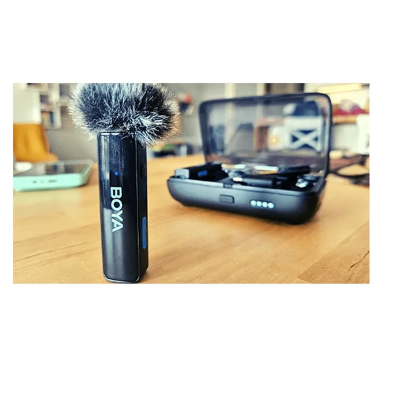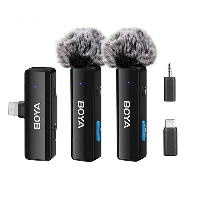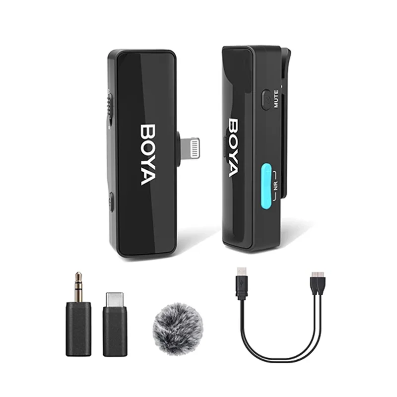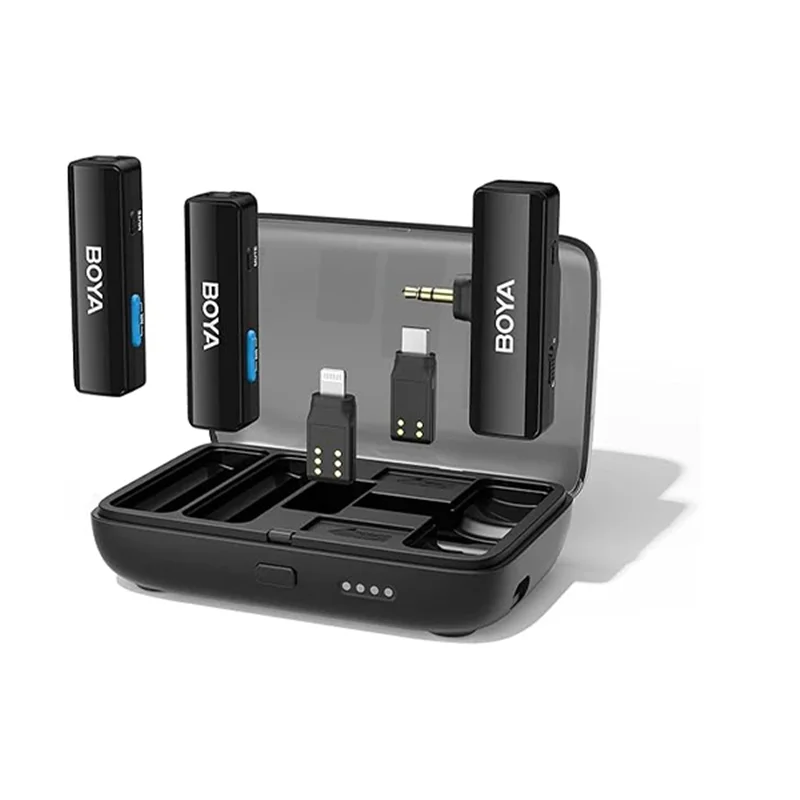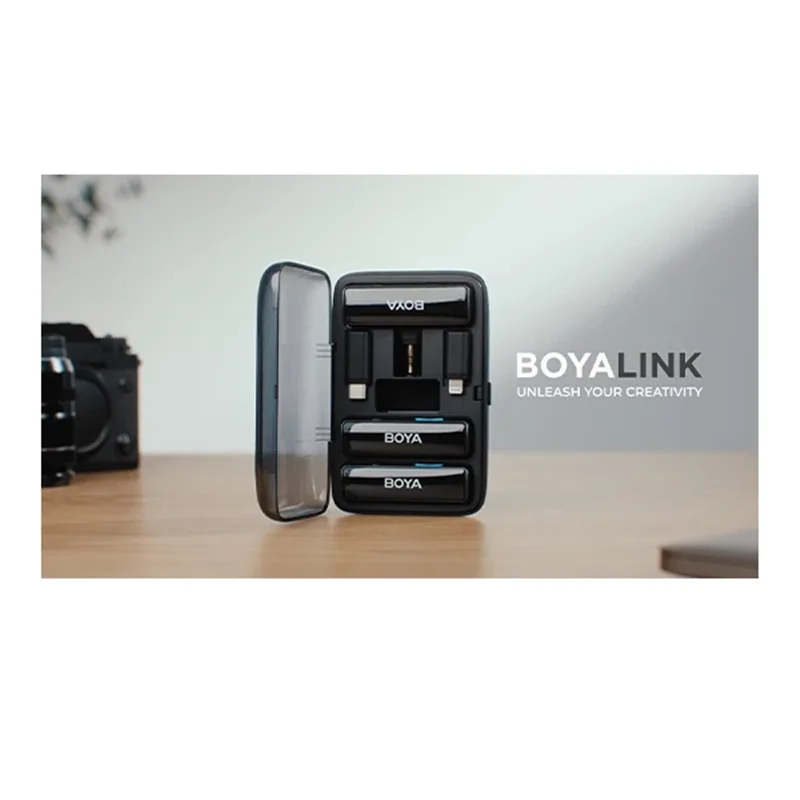 سیستم میکروفون بی سیم 2 نفره BOYA BOYALINK به شما امکان می دهد تا با استفاده از آداپتورهای قابل تعویض همراه، ویدیوهای ولاگی یا مصاحبه با دو سوژه را با مجموعه وسیعی از دستگاه ها ضبط کنید. یک کانکتور 3.5 میلی متری TRS برای دوربین، کانکتور USB-C و کانکتور لایتنینگ (آبفون) را می توان به راحتی به شیار تماس خروجی گیرنده دو کاناله متصل کرد. این سیستم شامل دو فرستنده گیره دار با میکروفون های چند جهته داخلی است تا ضبط صدای واضح را از فاصله 100 متر تسهیل کند. نشانگرهای LED روی قطعات به شما امکان می دهد عمر باتری و قدرت سیگنال را کنترل کنید.این سیستم همچنین شامل یک ضد باد خزدار، کابل شارژ USB-C و یک جعبه شارژ برای ذخیره و شارژ مجدد قطعات در صورت اتمام شارژ است.واحدهای فرستنده دارای باتری های داخلی 95 میلی آمپر ساعتی با زمان کار 10 ساعت هستند، در حالی که گیرنده دارای باتری 120 میلی آمپر ساعتی با زمان کار 6 ساعت است.پورت های USB-C روی هر یک از اجزا یا کیس شارژ موجود برای شارژ مجدد سیستم تنها در 1.5 ساعت موجود هستند.کیس شارژ دارای ظرفیت 1000 میلی آمپر ساعتی است که می تواند سیستم شما را دو بار شارژ کند. نشانگر LED قدرت به شما امکان می دهد ظرفیت باتری و وضعیت شارژ را بررسی کنید.